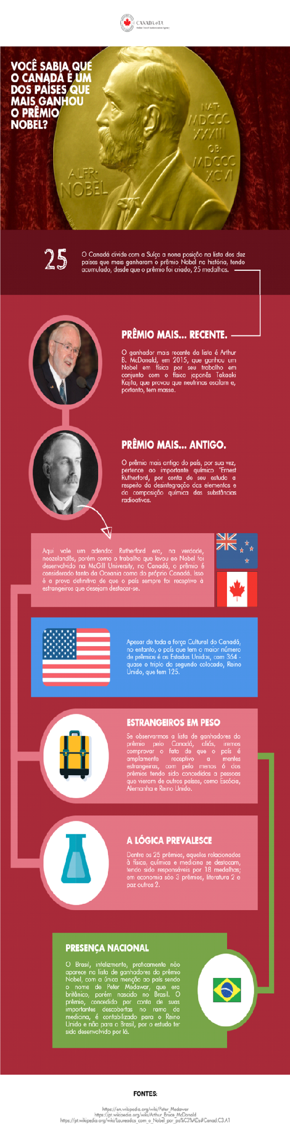 As belas paisagens, a educação da população e as excelentes opções de esportes de inverno do Canadá você já conhece, mas e a respeito do lado cultural do país, você já ouviu falar? Pois saiba que o Canadá é um dos países que tem o maior número de prêmios Nobel do mundo, sendo um local excelente para que grandes mentes desenvolvam o seu potencial e alcancem mudanças que sejam capazes de melhorar verdadeiramente a humanidade. Conheça no infográfico a seguir a relação do Canadá com esse prêmio tão importante.